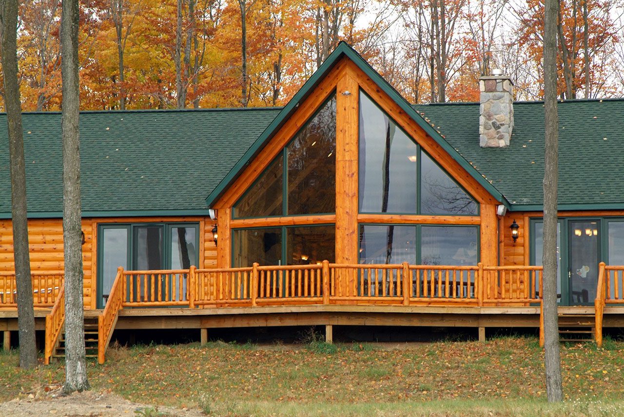 Auhentic inside and out. That’s what WoodHaven’s products have done for this stick-built home in Fairview, Michigan. Our 3×10 hewn log siding with butt-n-pass corners and 4×6 “D” trim gives the home’s exterior a full-log appearance, without the full-log price. Our cedar log railing provides safety and security for those taking in the beautiful view on the deck.